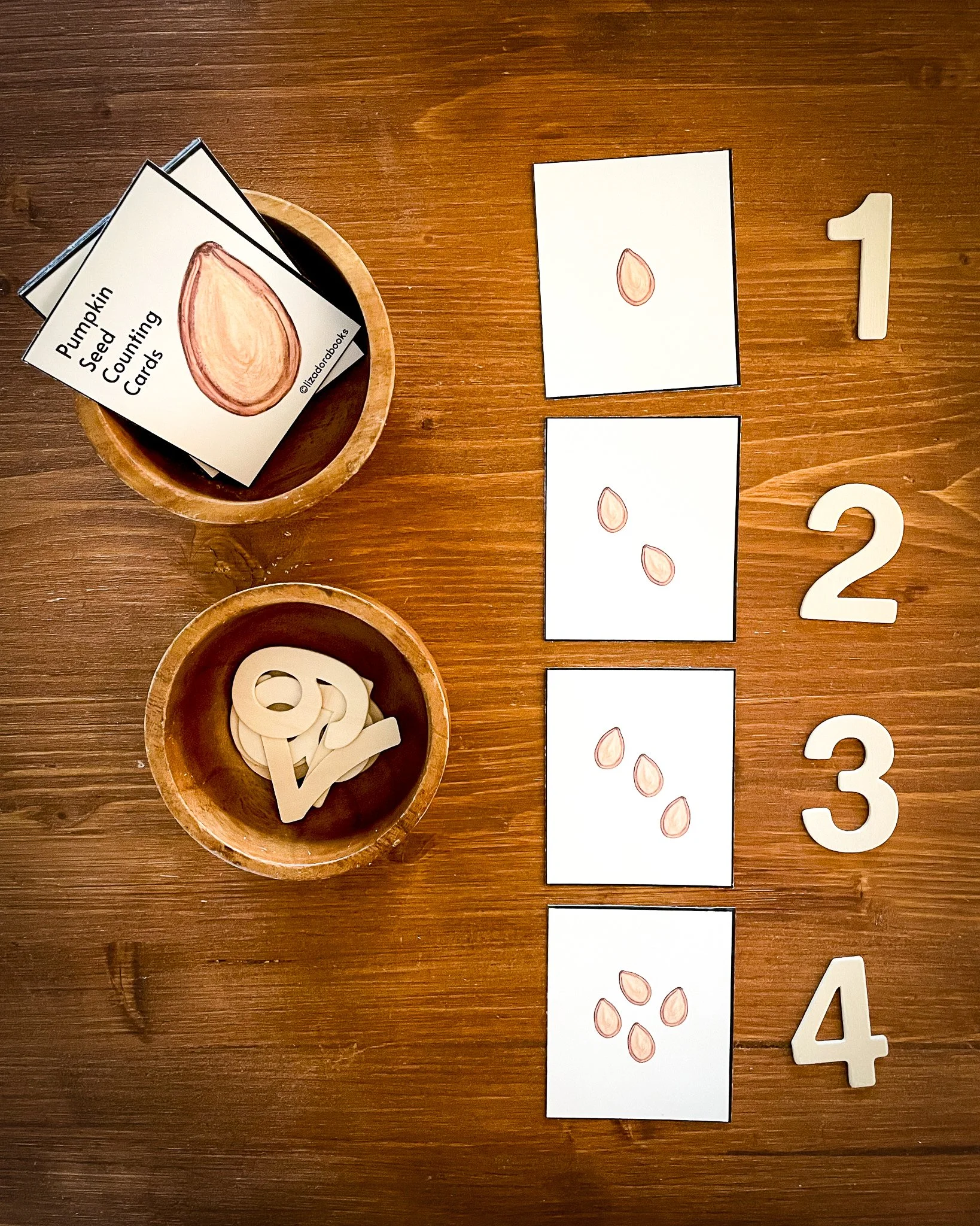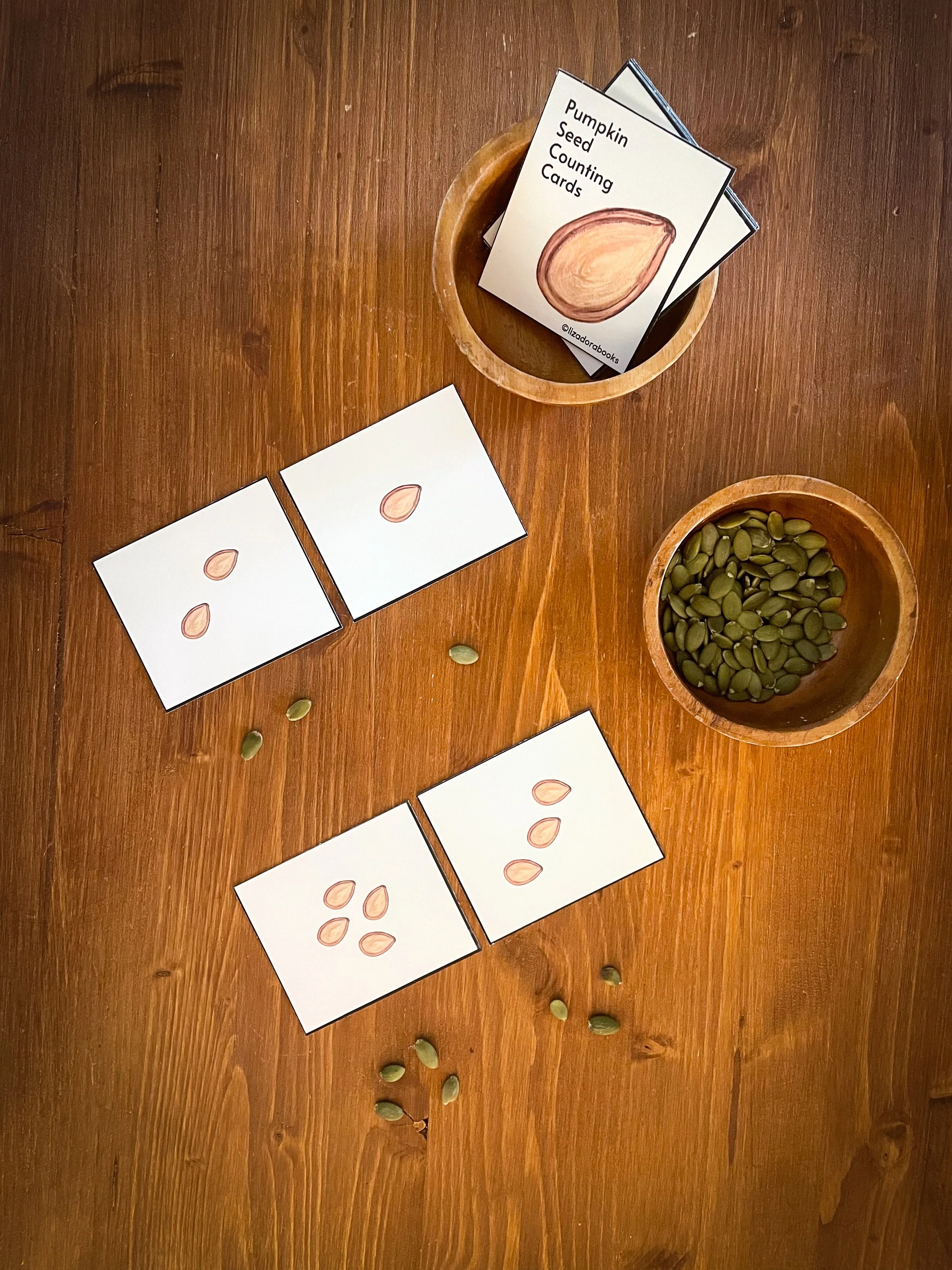We love to keep it simple: one bowl of real pumpkin seeds (or acorns, buttons, small stones, whatever you have that they won’t eat!) and the stack of counting cards in the other bowl. That’s it. Place the tray on the table or on the floor and let your child explore.